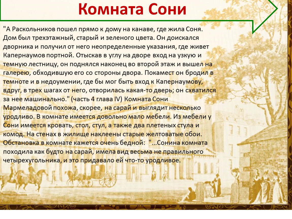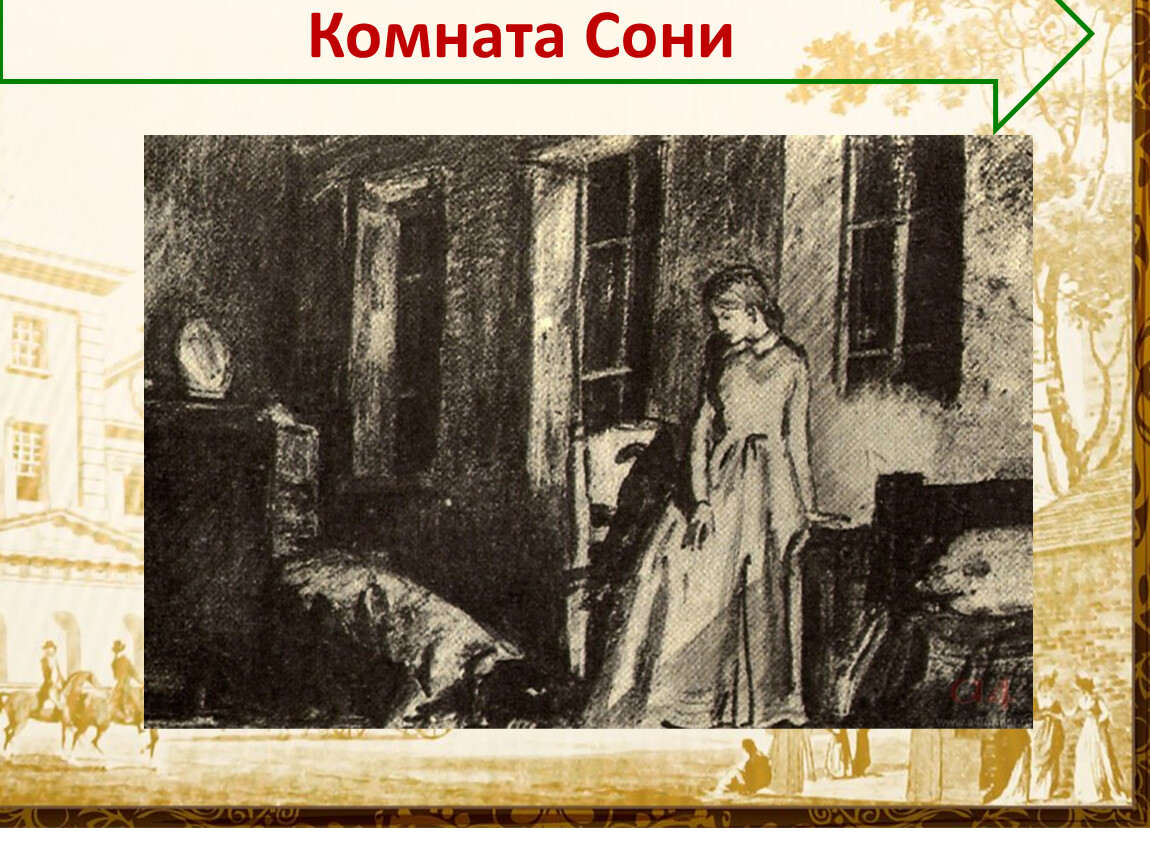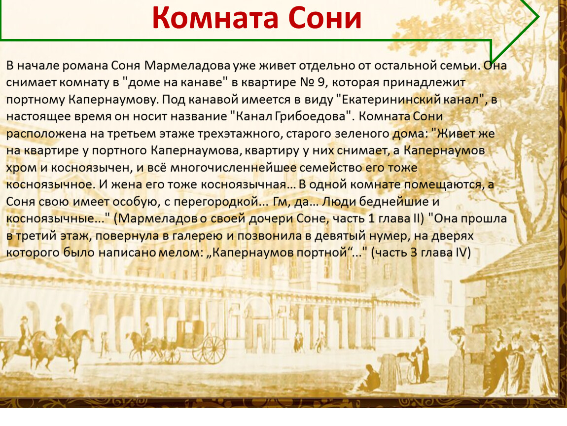 Комната Сони Мармеладовой в романе "Преступление и наказание" 18-летняя Соня Мармеладова живет отдельно от своей семьи (семьи Мармеладовых). Она снимает жилье недалеко от них, в том же районе. Почему Соня живет отдельно от семьи? Всему виной ее "ремесло", профессия. Хозяйка квартиры Амалия Липпевехзель и другие жильцы (в том числе Лебезятников) выжили девушку из родительской квартиры из-за ее "дурной репутации": "...с тех пор дочь моя, Софья Семеновна, желтый билет принуждена была получить, и уже вместе с нами по случаю сему не могла оставаться. <...> И заходит к нам Сонечка теперь более в сумерки, и Катерину Ивановну облегчает, и средства посильные доставляет..." (Мармеладов о своей дочери Соне, часть 1 глава II)
