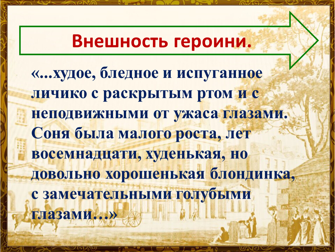 «...худое, бледное и испуганное личико с раскрытым ртом и с неподвижными от ужаса глазами. Соня была малого роста, лет восемнадцати, худенькая, но довольно хорошенькая блондинка, с замечательными голубыми глазами…»