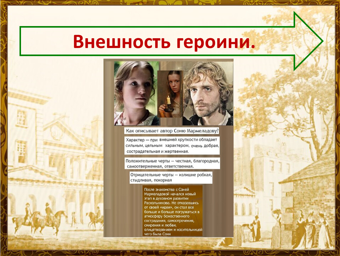 Итак, Соня – это символ, это нравственный идеал Достоевского, и не только. Она - божественный идеал. Именно в образе Сони Достоевский сконцентрировал самые высокие христианские добродетели: смирение, милосердие, сострадание и любовь к людям, жертвенность.