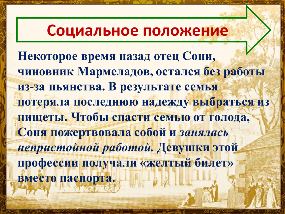 Некоторое время назад отец Сони, чиновник Мармеладов, остался без работы из-за пьянства. В результате семья потеряла последнюю надежду выбраться из нищеты. Чтобы спасти семью от голода, Соня пожертвовала собой и занялась непристойной работой. Девушки этой профессии получали «желтый билет» вместо паспорта.