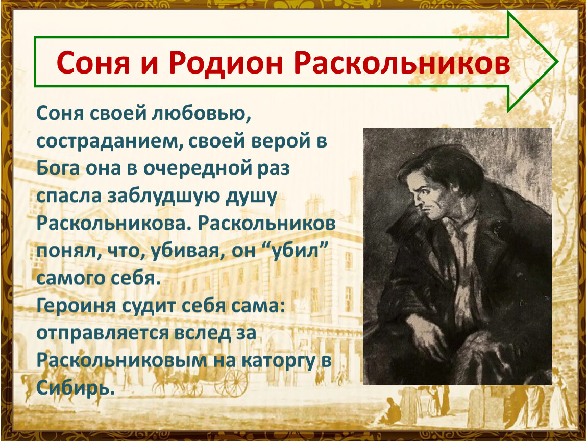 Соня своей любовью, состраданием, своей верой в Бога она в очередной раз спасла заблудшую душу Раскольникова. Раскольников понял, что, убивая, он “убил” самого себя.