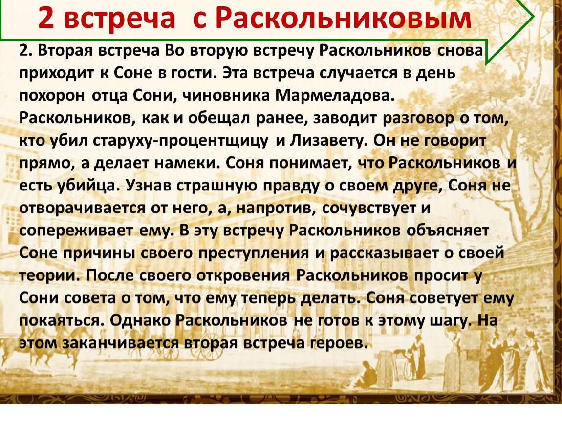 2. Вторая встреча Во вторую встречу Раскольников снова приходит к Соне в гости. Эта встреча случается в день похорон отца Сони, чиновника Мармеладова. Раскольников, как и обещал ранее, заводит разговор о том, кто убил старуху-процентщицу и Лизавету. Он не говорит прямо, а делает намеки. Соня понимает, что Раскольников и есть убийца. Узнав страшную правду о своем друге, Соня не отворачивается от него, а, напротив, сочувствует и сопереживает ему. В эту встречу Раскольников объясняет Соне причины своего преступления и рассказывает о своей теории. После своего откровения Раскольников просит у Сони совета о том, что ему теперь делать. Соня советует ему покаяться. Однако Раскольников не готов к этому шагу. На этом заканчивается вторая встреча героев.