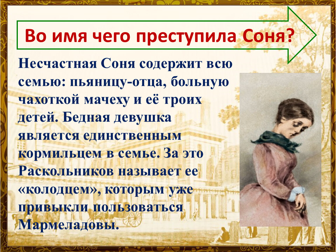 Несчастная Соня содержит всю семью: пьяницу-отца, больную чахоткой мачеху и её троих детей. Бедная девушка является единственным кормильцем в семье. За это Раскольников называет ее «колодцем», которым уже привыкли пользоваться Мармеладовы.