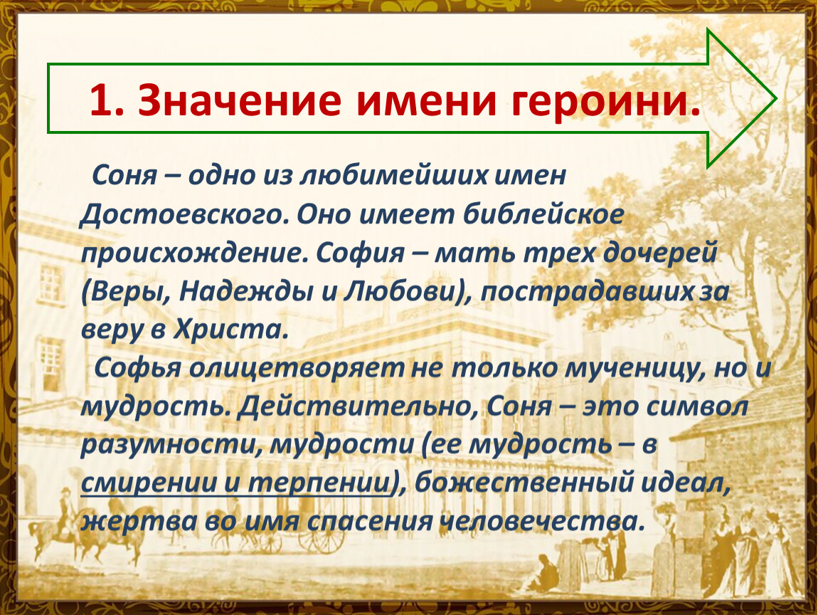 Соня – одно из любимейших имен Достоевского. Оно имеет библейское происхождение. София – мать трех дочерей (Веры, Надежды и Любови), пострадавших за веру в Христа.