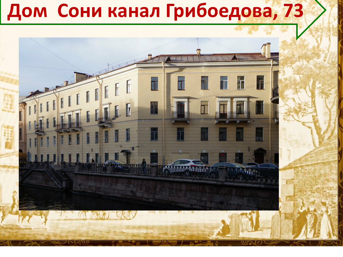 В начале романа Соня Мармеладова уже живет отдельно от остальной семьи. Она снимает комнату в "доме на канаве" в квартире № 9, которая принадлежит портному Капернаумову. Под канавой имеется в виду "Екатерининский канал", в настоящее время он носит название "Канал Грибоедова". Комната Сони расположена на третьем этаже трехэтажного, старого зеленого дома: "Живет же на квартире у портного Капернаумова, квартиру у них снимает, а Капернаумов хром и косноязычен, и всё многочисленнейшее семейство его тоже косноязычное. И жена его тоже косноязычная… В одной комнате помещаются, а Соня свою имеет особую, с перегородкой... Гм, да… Люди беднейшие и косноязычные..." (Мармеладов о своей дочери Соне, часть 1 глава II) "Она прошла в третий этаж, повернула в галерею и позвонила в девятый нумер, на дверях которого было написано мелом: „Капернаумов портной“..." (часть 3 глава IV)