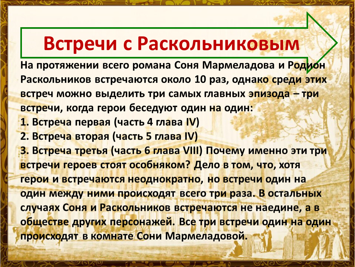 3. Встреча третья (часть 6 глава VIII) Почему именно эти три встречи героев стоят особняком? Дело в том, что, хотя герои и встречаются неоднократно, но встречи один на один между ними происходят всего три раза. В остальных случаях Соня и Раскольников встречаются не наедине, а в обществе других персонажей. Все три встречи один на один происходят в комнате Сони Мармеладовой.