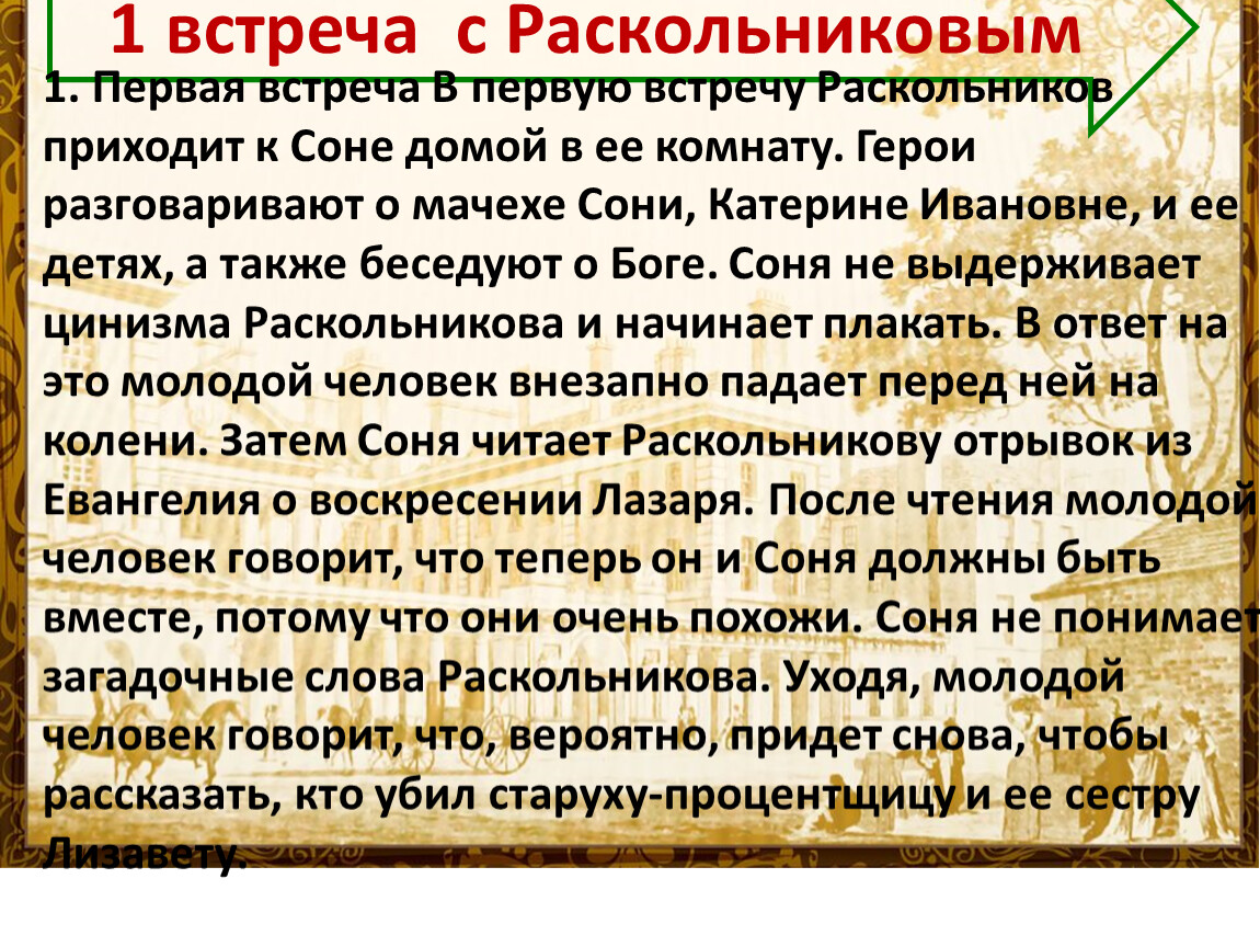 1. Первая встреча В первую встречу Раскольников приходит к Соне домой в ее комнату. Герои разговаривают о мачехе Сони, Катерине Ивановне, и ее детях, а также беседуют о Боге. Соня не выдерживает цинизма Раскольникова и начинает плакать. В ответ на это молодой человек внезапно падает перед ней на колени. Затем Соня читает Раскольникову отрывок из Евангелия о воскресении Лазаря. После чтения молодой человек говорит, что теперь он и Соня должны быть вместе, потому что они очень похожи. Соня не понимает загадочные слова Раскольникова. Уходя, молодой человек говорит, что, вероятно, придет снова, чтобы рассказать, кто убил старуху-процентщицу и ее сестру Лизавету.