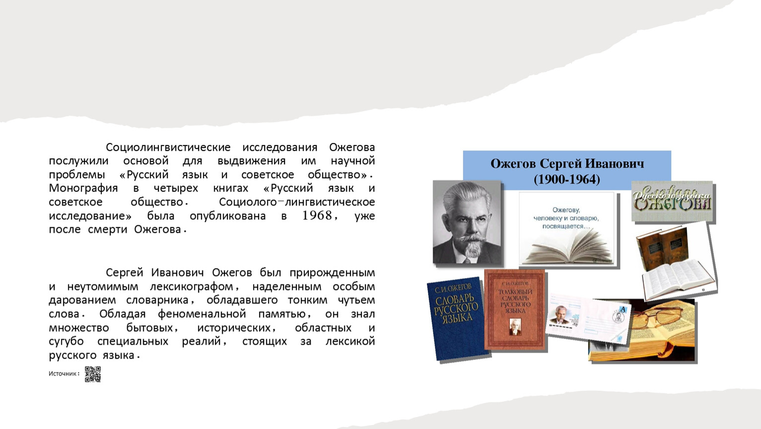 Сергей Иванович Ожегов был прирожденным и неутомимым лексикографом, наделенным особым дарованием словарника, обладавшего тонким чутьем слова. Обладая феноменальной памятью, он знал множество бытовых, исторических, областных и сугубо специальных реалий, стоящих за лексикой русского языка.