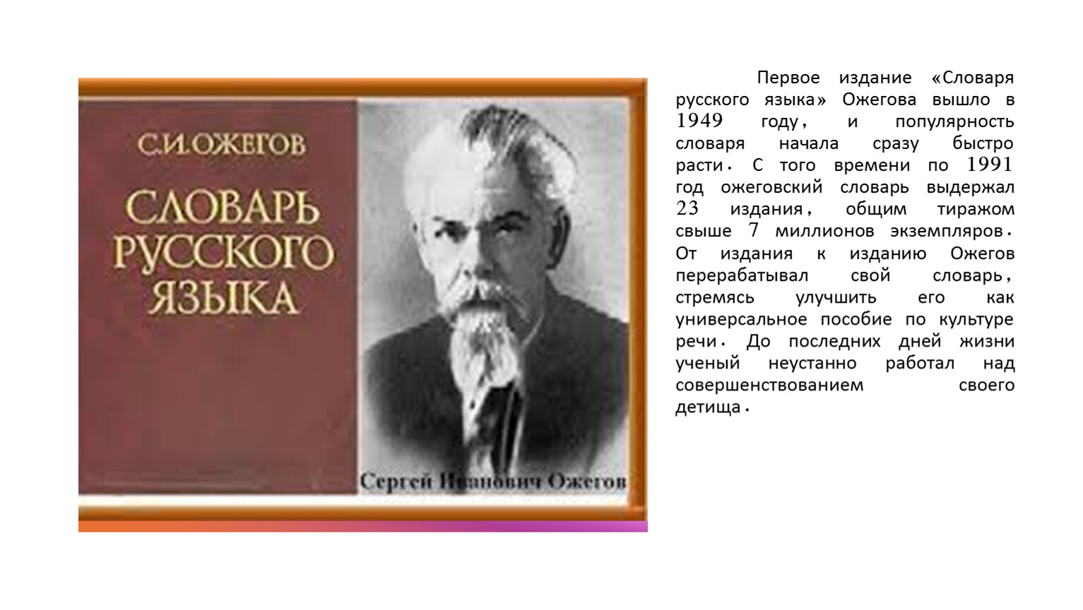 Первое издание «Словаря русского языка» Ожегова вышло в 1949 году, и популярность словаря начала сразу быстро расти. С того времени по 1991 год ожеговский словарь выдержал 23 издания, общим тиражом свыше 7 миллионов экземпляров. От издания к изданию Ожегов перерабатывал свой словарь, стремясь улучшить его как универсальное пособие по культуре речи. До последних дней жизни ученый неустанно работал над совершенствованием своего детища.