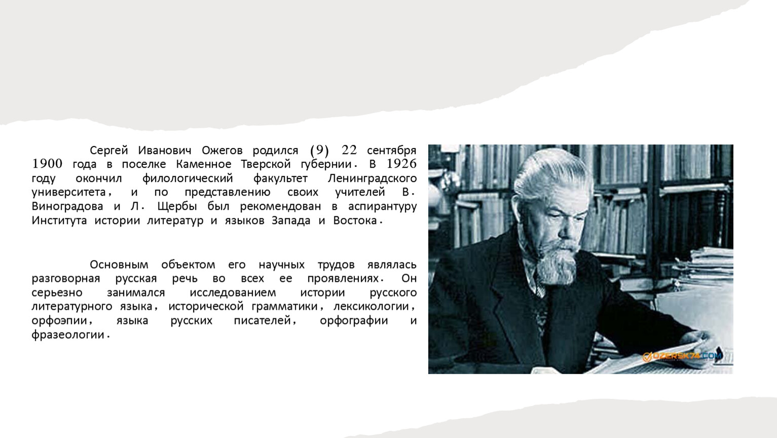 Сергей Иванович Ожегов родился (9) 22 сентября 1900 года в поселке Каменное Тверской губернии. В 1926 году окончил филологический факультет Ленинградского университета, и по представлению своих учителей В. Виноградова и Л. Щербы был рекомендован в аспирантуру Института истории литератур и языков Запада и Востока.