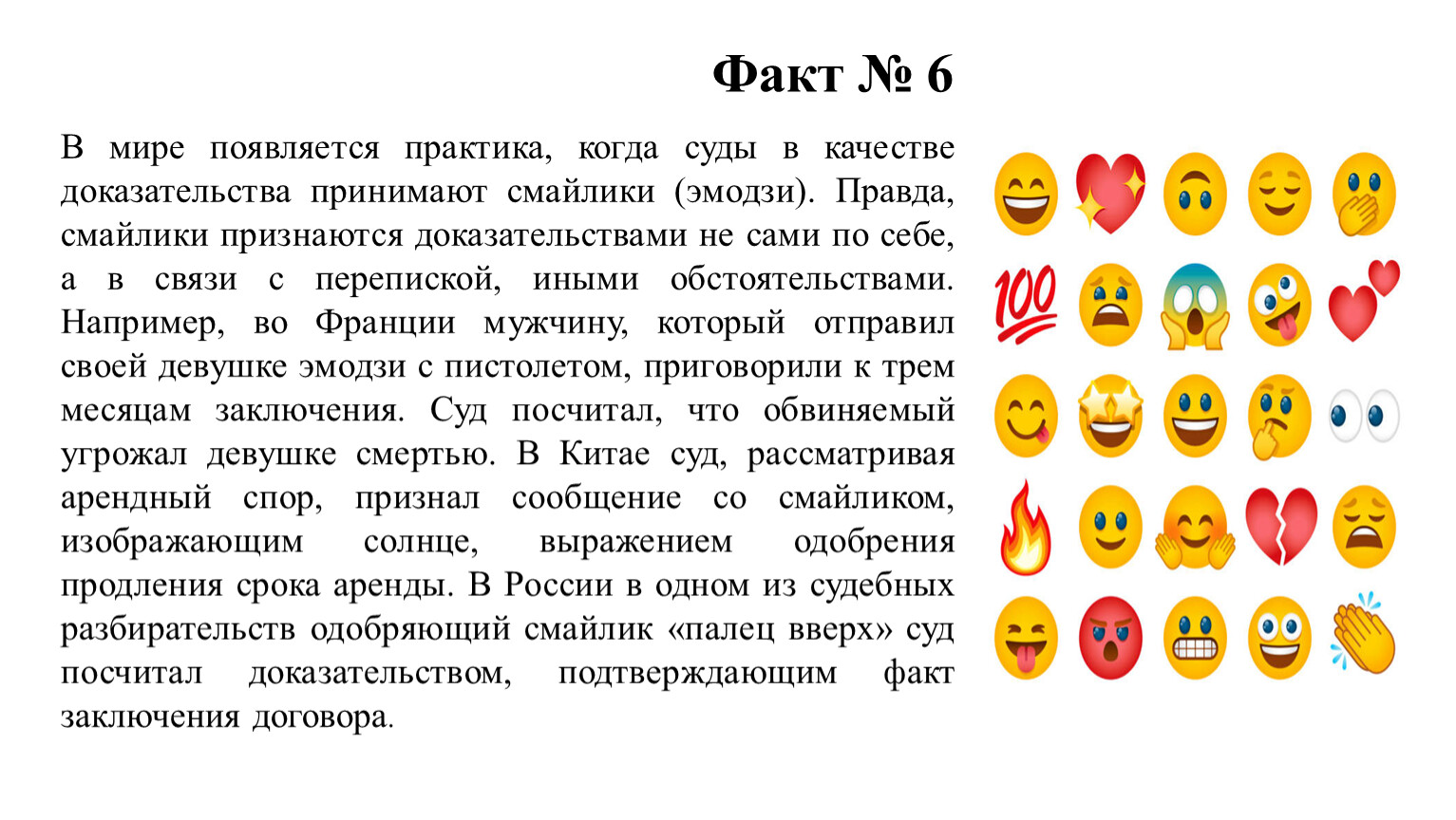 В мире появляется практика, когда суды в качестве доказательства принимают смайлики (эмодзи). Правда, смайлики признаются доказательствами не сами по себе, а в связи с перепиской, иными обстоятельствами. Например, во Франции мужчину, который отправил своей девушке эмодзи с пистолетом, приговорили к трем месяцам заключения. Суд посчитал, что обвиняемый угрожал девушке смертью. В Китае суд, рассматривая арендный спор, признал сообщение со смайликом, изображающим солнце, выражением одобрения продления срока аренды. В России в одном из судебных разбирательств одобряющий смайлик «палец вверх» суд посчитал доказательством, подтверждающим факт заключения договора.