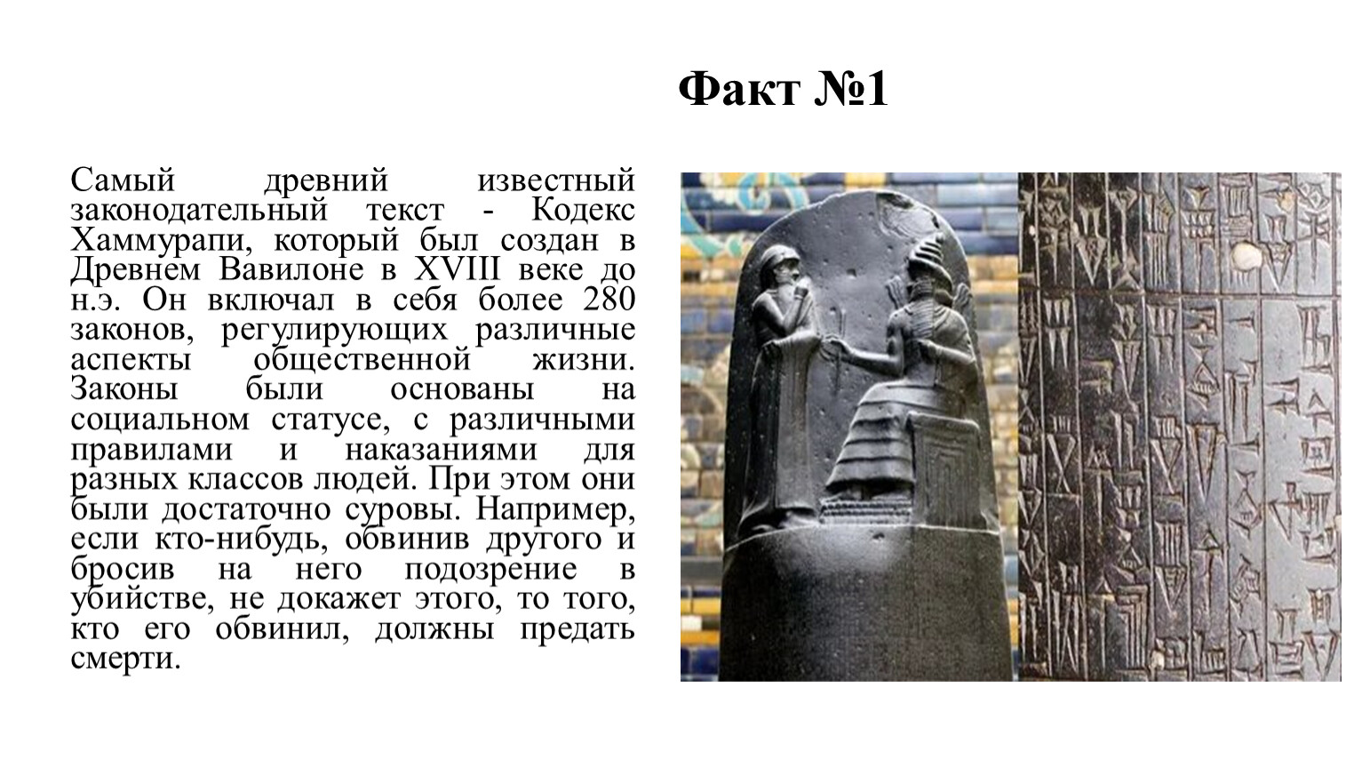 Самый древний известный законодательный текст - Кодекс Хаммурапи, который был создан в Древнем Вавилоне в XVIII веке до н.э. Он включал в себя более 280 законов, регулирующих различные аспекты общественной жизни. Законы были основаны на социальном статусе, с различными правилами и наказаниями для разных классов людей. При этом они были достаточно суровы. Например, если кто-нибудь, обвинив другого и бросив на него подозрение в убийстве, не докажет этого, то того, кто его обвинил, должны предать смерти.