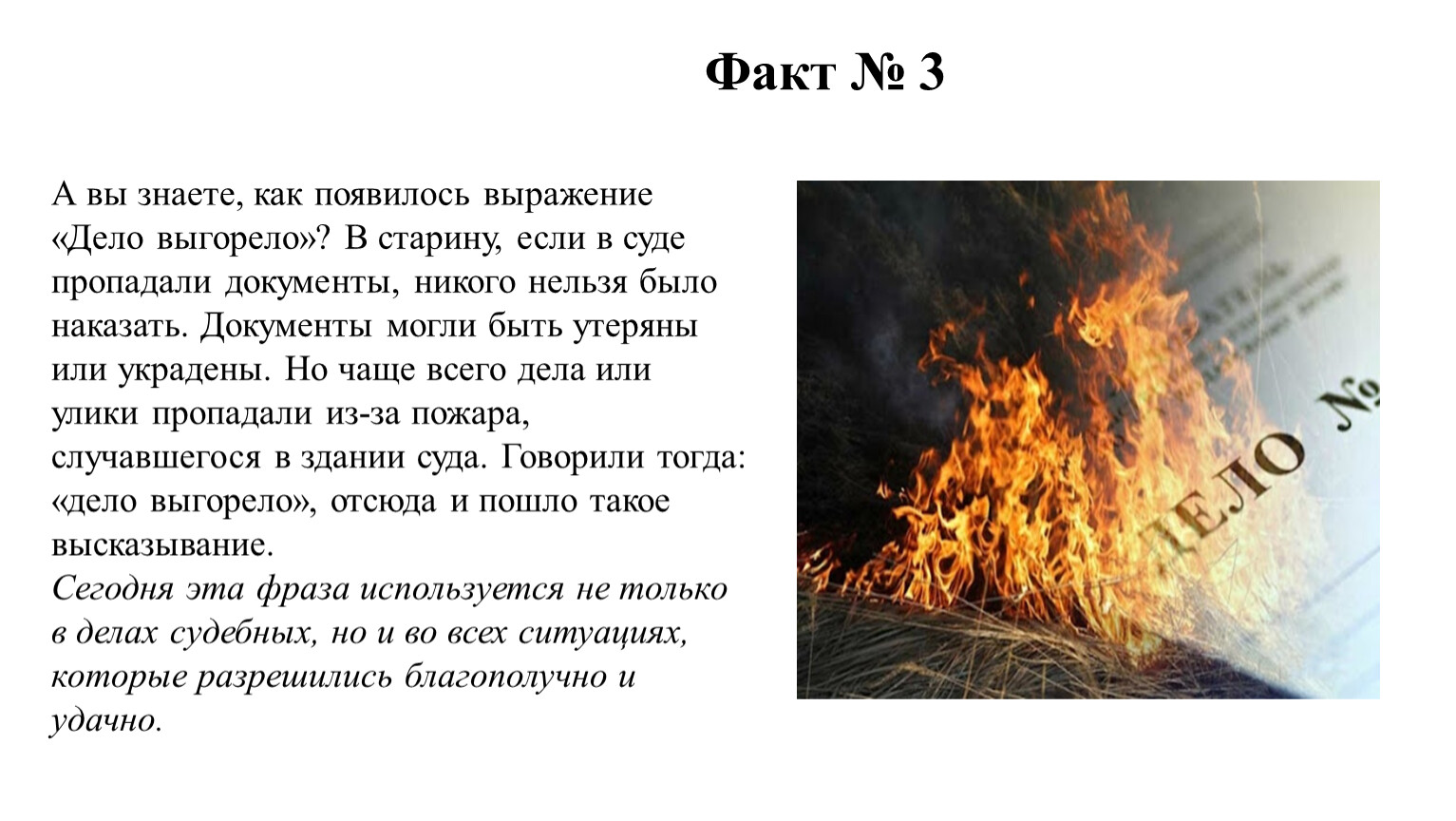 А вы знаете, как появилось выражение «Дело выгорело»? В старину, если в суде пропадали документы, никого нельзя было наказать. Документы могли быть утеряны или украдены. Но чаще всего дела или улики пропадали из-за пожара, случавшегося в здании суда. Говорили тогда: «дело выгорело», отсюда и пошло такое высказывание.Сегодня эта фраза используется не только в делах судебных, но и во всех ситуациях, которые разрешились благополучно и удачно.