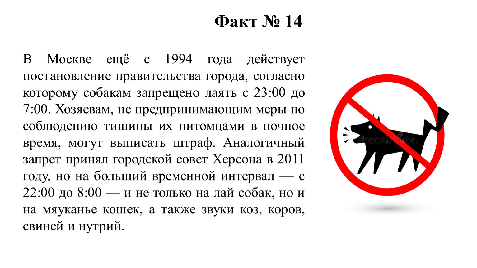 В Москве ещё с 1994 года действует постановление правительства города, согласно которому собакам запрещено лаять с 23:00 до 7:00. Хозяевам, не предпринимающим меры по соблюдению тишины их питомцами в ночное время, могут выписать штраф. Аналогичный запрет принял городской совет Херсона в 2011 году, но на больший временной интервал — с 22:00 до 8:00 — и не только на лай собак, но и на мяуканье кошек, а также звуки коз, коров, свиней и нутрий.