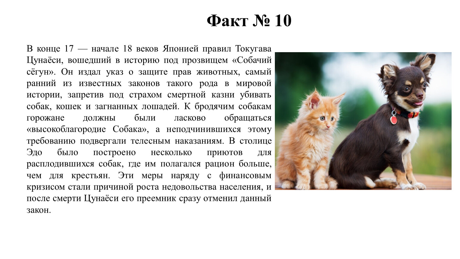 В конце 17 — начале 18 веков Японией правил Токугава Цунаёси, вошедший в историю под прозвищем «Собачий сёгун». Он издал указ о защите прав животных, самый ранний из известных законов такого рода в мировой истории, запретив под страхом смертной казни убивать собак, кошек и загнанных лошадей. К бродячим собакам горожане должны были ласково обращаться «высокоблагородие Собака», а неподчинившихся этому требованию подвергали телесным наказаниям. В столице Эдо было построено несколько приютов для расплодившихся собак, где им полагался рацион больше, чем для крестьян. Эти меры наряду с финансовым кризисом стали причиной роста недовольства населения, и после смерти Цунаёси его преемник сразу отменил данный закон.