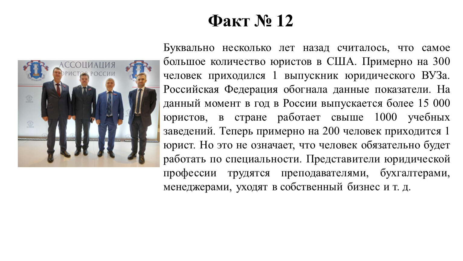 Буквально несколько лет назад считалось, что самое большое количество юристов в США. Примерно на 300 человек приходился 1 выпускник юридического ВУЗа. Российская Федерация обогнала данные показатели. На данный момент в год в России выпускается более 15 000 юристов, в стране работает свыше 1000 учебных заведений. Теперь примерно на 200 человек приходится 1 юрист. Но это не означает, что человек обязательно будет работать по специальности. Представители юридической профессии трудятся преподавателями, бухгалтерами, менеджерами, уходят в собственный бизнес и т. д.