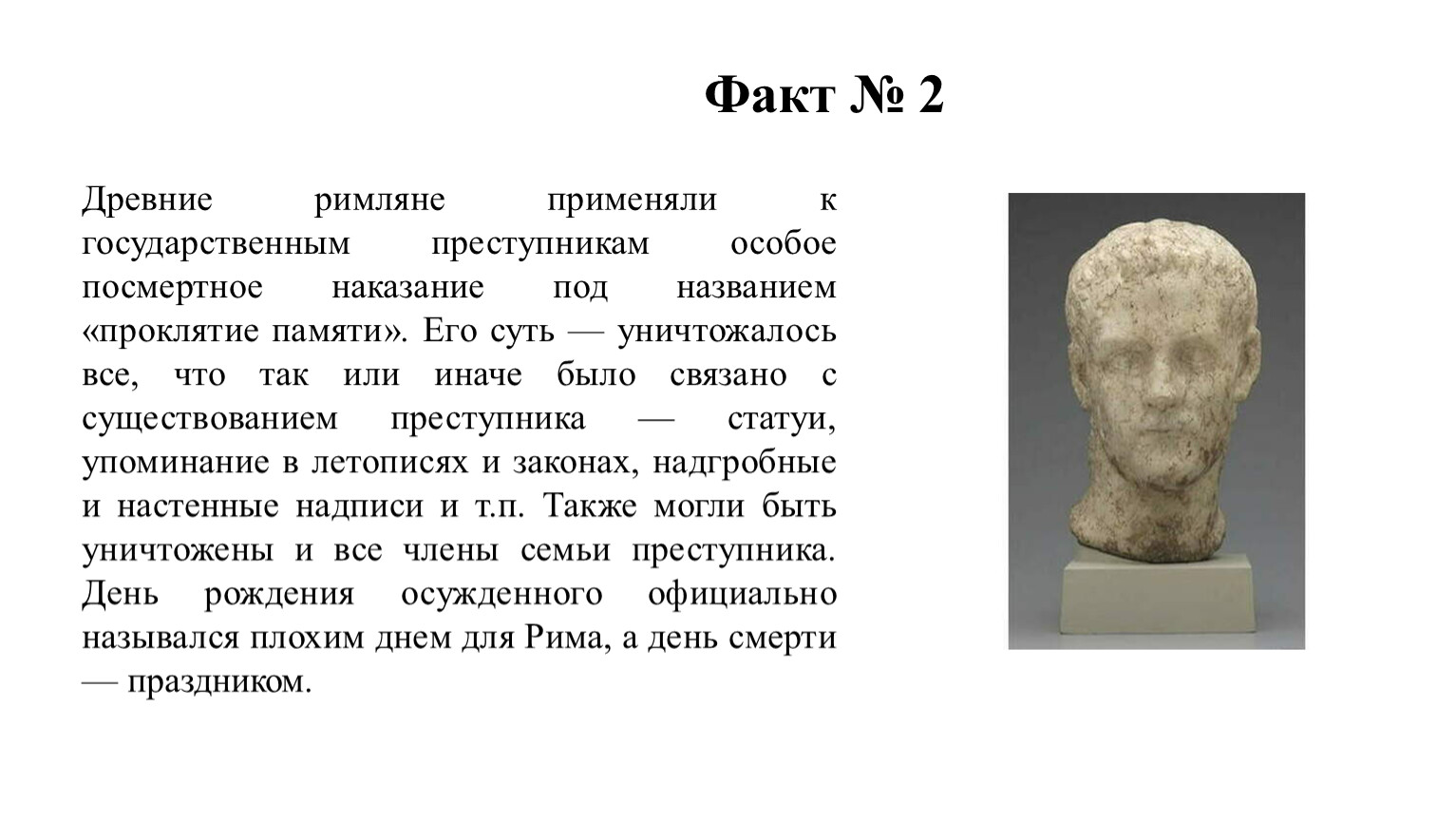 Древние римляне применяли к государственным преступникам особое посмертное наказание под названием «проклятие памяти». Его суть — уничтожалось все, что так или иначе было связано с существованием преступника — статуи, упоминание в летописях и законах, надгробные и настенные надписи и т.п. Также могли быть уничтожены и все члены семьи преступника. День рождения осужденного официально назывался плохим днем для Рима, а день смерти — праздником.