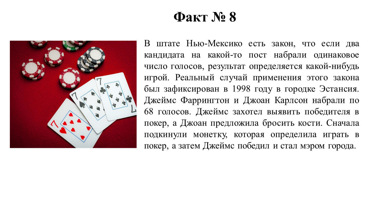 В штате Нью-Мексико есть закон, что если два кандидата на какой-то пост набрали одинаковое число голосов, результат определяется какой-нибудь игрой. Реальный случай применения этого закона был зафиксирован в 1998 году в городке Эстансия. Джеймс Фаррингтон и Джоан Карлсон набрали по 68 голосов. Джеймс захотел выявить победителя в покер, а Джоан предложила бросить кости. Сначала подкинули монетку, которая определила играть в покер, а затем Джеймс победил и стал мэром города.