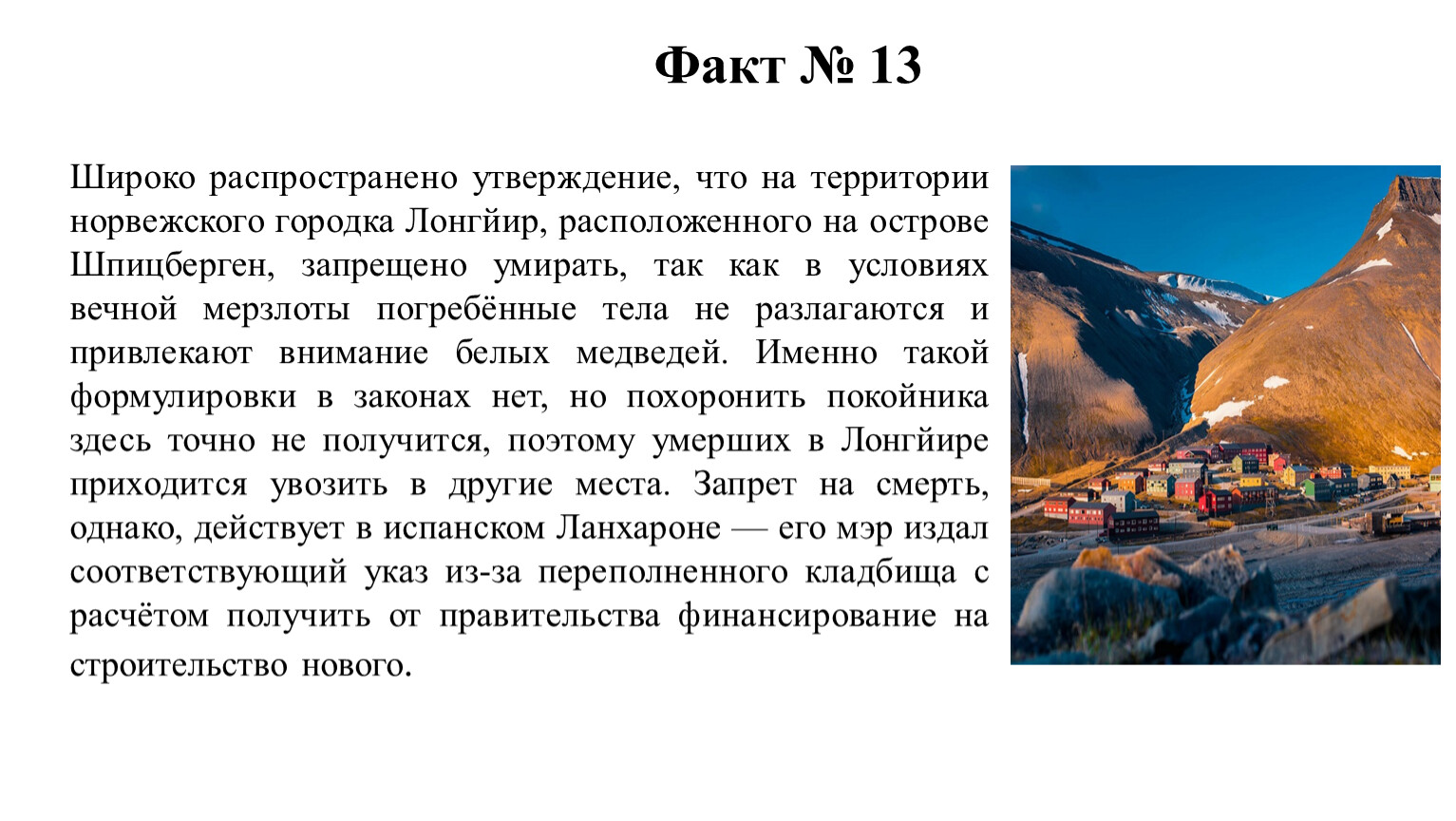 Широко распространено утверждение, что на территории норвежского городка Лонгйир, расположенного на острове Шпицберген, запрещено умирать, так как в условиях вечной мерзлоты погребённые тела не разлагаются и привлекают внимание белых медведей. Именно такой формулировки в законах нет, но похоронить покойника здесь точно не получится, поэтому умерших в Лонгйире приходится увозить в другие места. Запрет на смерть, однако, действует в испанском Ланхароне — его мэр издал соответствующий указ из-за переполненного кладбища с расчётом получить от правительства финансирование на строительство нового.