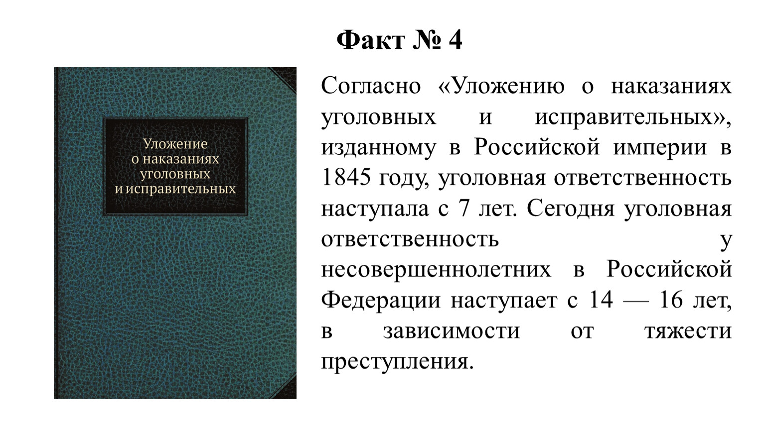 Согласно «Уложению о наказаниях уголовных и исправительных», изданному в Российской империи в 1845 году, уголовная ответственность наступала с 7 лет. Сегодня уголовная ответственность у несовершеннолетних в Российской Федерации наступает с 14 — 16 лет, в зависимости от тяжести преступления.
