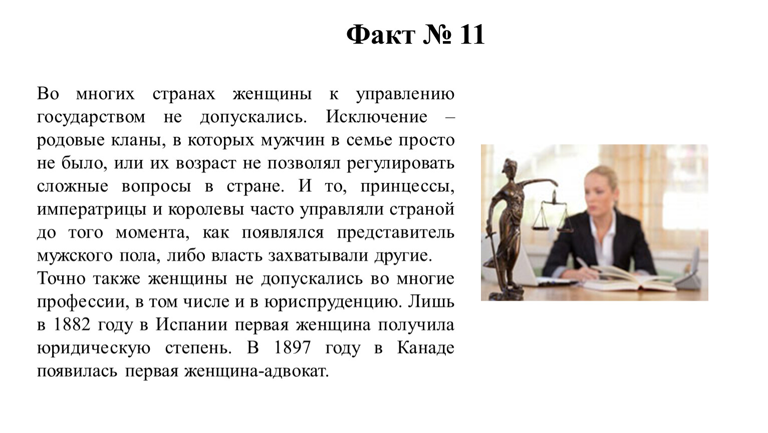Точно также женщины не допускались во многие профессии, в том числе и в юриспруденцию. Лишь в 1882 году в Испании первая женщина получила юридическую степень. В 1897 году в Канаде появилась первая женщина-адвокат.