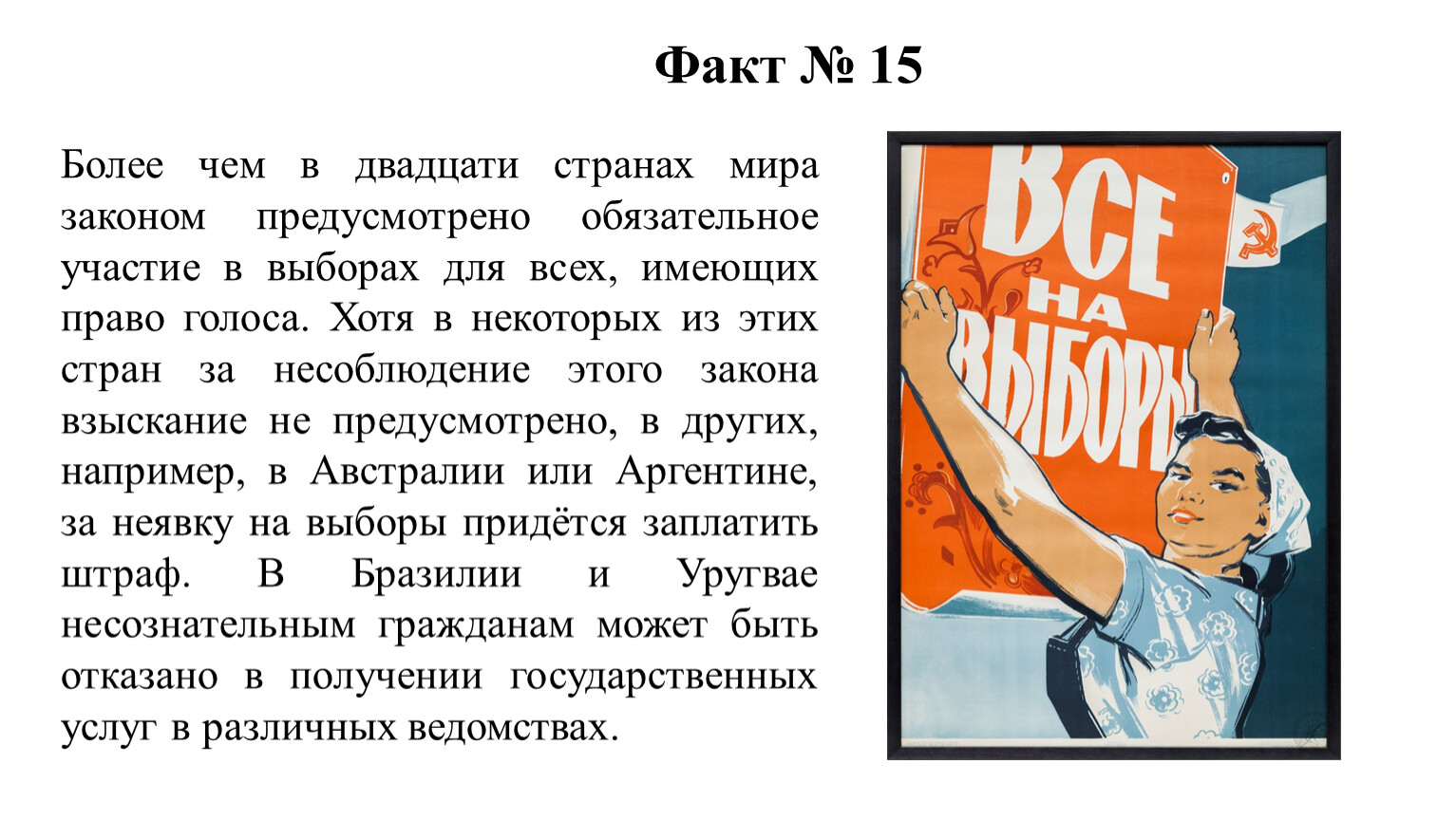 Более чем в двадцати странах мира законом предусмотрено обязательное участие в выборах для всех, имеющих право голоса. Хотя в некоторых из этих стран за несоблюдение этого закона взыскание не предусмотрено, в других, например, в Австралии или Аргентине, за неявку на выборы придётся заплатить штраф. В Бразилии и Уругвае несознательным гражданам может быть отказано в получении государственных услуг в различных ведомствах.