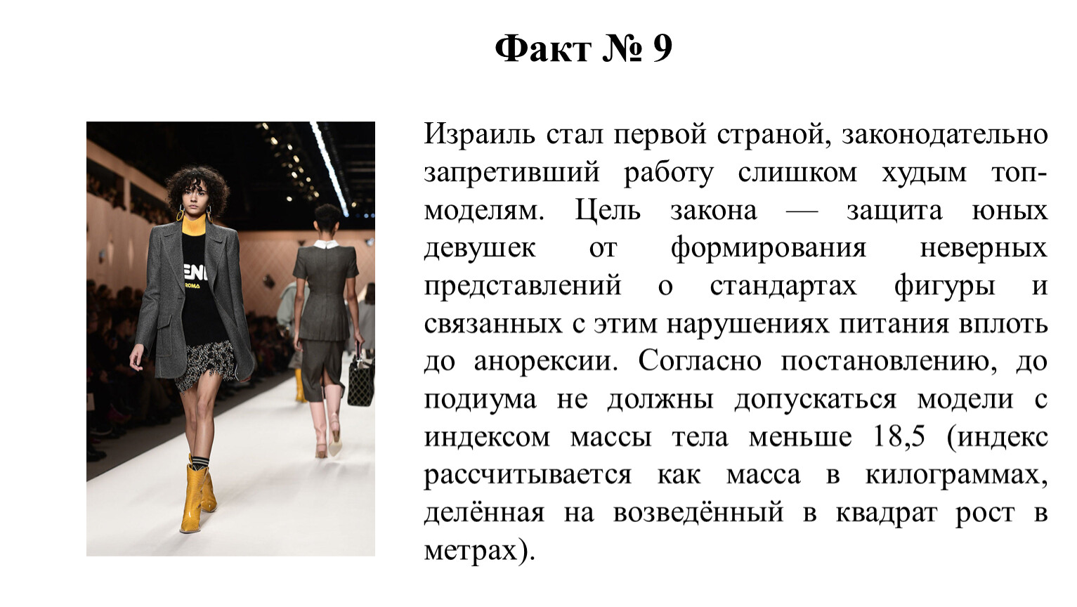 Израиль стал первой страной, законодательно запретивший работу слишком худым топ-моделям. Цель закона — защита юных девушек от формирования неверных представлений о стандартах фигуры и связанных с этим нарушениях питания вплоть до анорексии. Согласно постановлению, до подиума не должны допускаться модели с индексом массы тела меньше 18,5 (индекс рассчитывается как масса в килограммах, делённая на возведённый в квадрат рост в метрах).