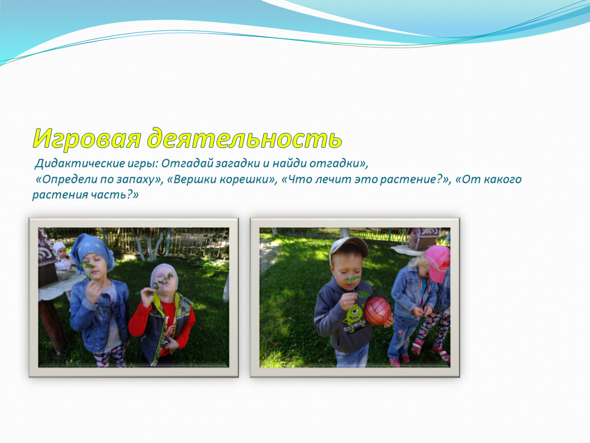 Игровая деятельность Дидактические игры: Отгадай загадки и найди отгадки», «Определи по запаху», «Вершки корешки», «Что лечит это растение?», «От какого растения часть?»