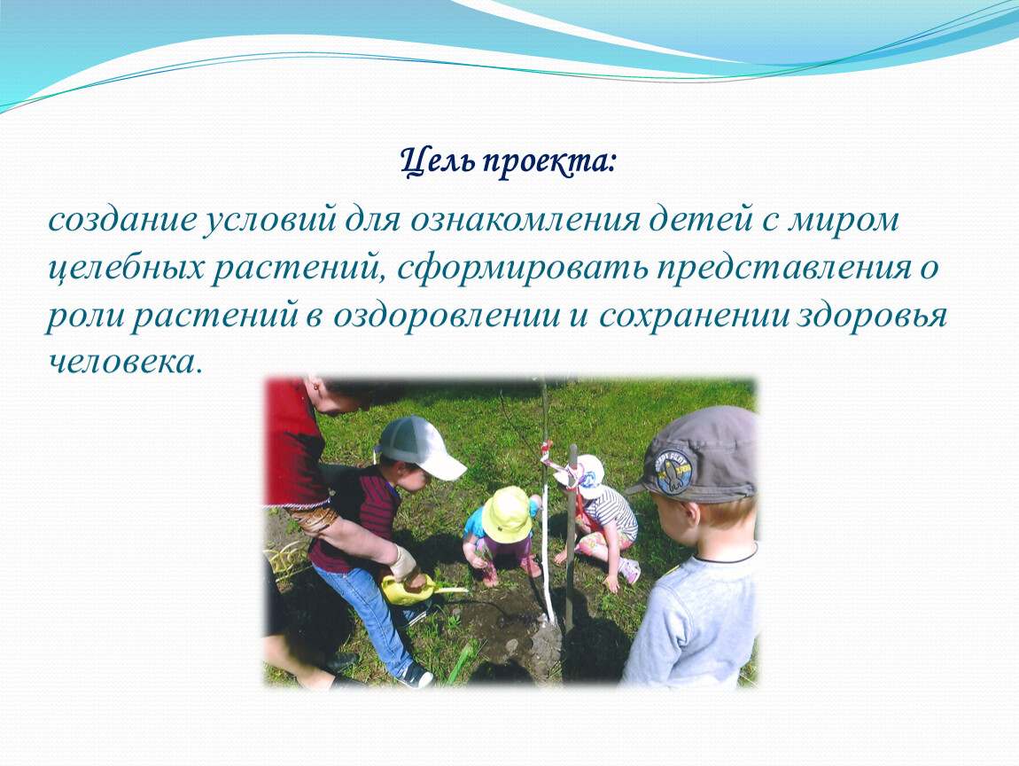 Цель проекта: создание условий для ознакомления детей с миром целебных растений, сформировать представления о роли растений в оздоровлении и сохранении здоровья человека.