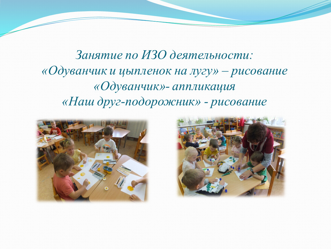 Занятие по ИЗО деятельности:«Одуванчик и цыпленок на лугу» – рисование«Одуванчик»- аппликация«Наш друг-подорожник» - рисование