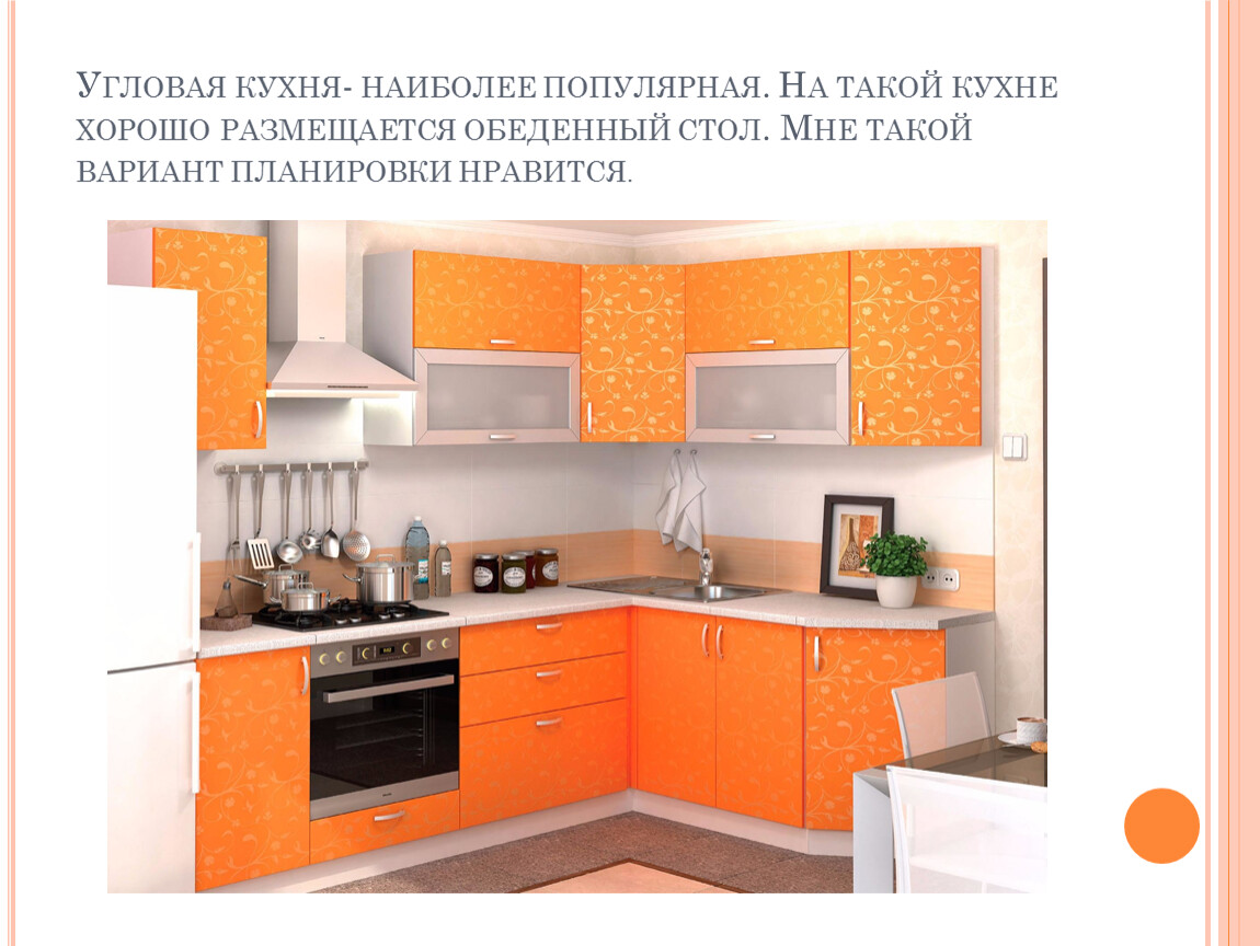 Угловая кухня- наиболее популярная. На такой кухне хорошо размещается обеденный стол. Мне такой вариант планировки нравится.