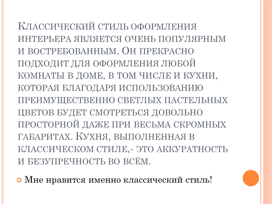 Классический стиль оформления интерьера является очень популярным и востребованным. Он прекрасно подходит для оформления любой комнаты в доме, в том числе и кухни, которая благодаря использованию преимущественно светлых пастельных цветов будет смотреться довольно просторной даже при весьма скромных габаритах. Кухня, выполненная в классическом стиле,- это аккуратность и безупречность во всём.