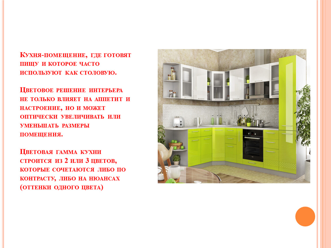 Кухня-помещение, где готовятпищу и которое частоиспользуют как столовую.Цветовое решение интерьеране только влияет на аппетит инастроение, но и можетоптически увеличивать илиуменьшать размерыпомещения.Цветовая гамма кухнистроится из 2 или 3 цветов,которые сочетаются либо поконтрасту, либо на нюансах(оттенки одного цвета)