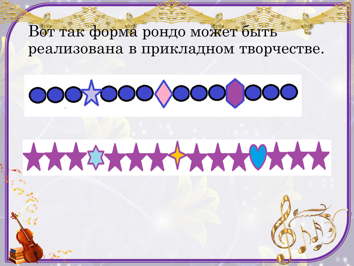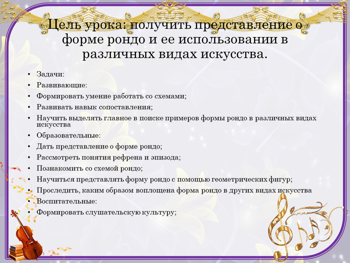 Цель урока: получить представление о форме рондо и ее использовании в различных видах искусства.
