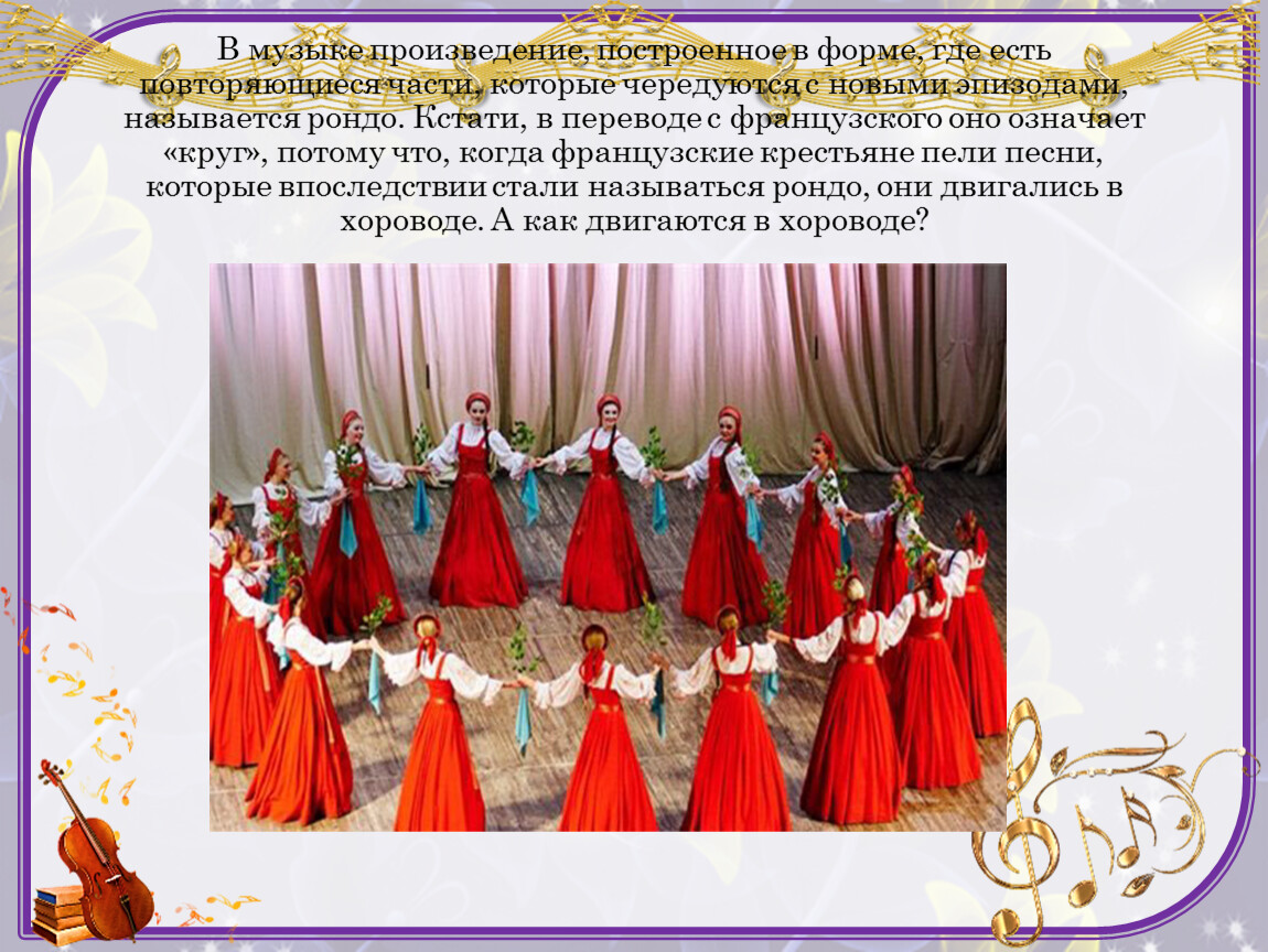 В музыке произведение, построенное в форме, где есть повторяющиеся части, которые чередуются с новыми эпизодами, называется рондо. Кстати, в переводе с французского оно означает «круг», потому что, когда французские крестьяне пели песни, которые впоследствии стали называться рондо, они двигались в хороводе. А как двигаются в хороводе?
