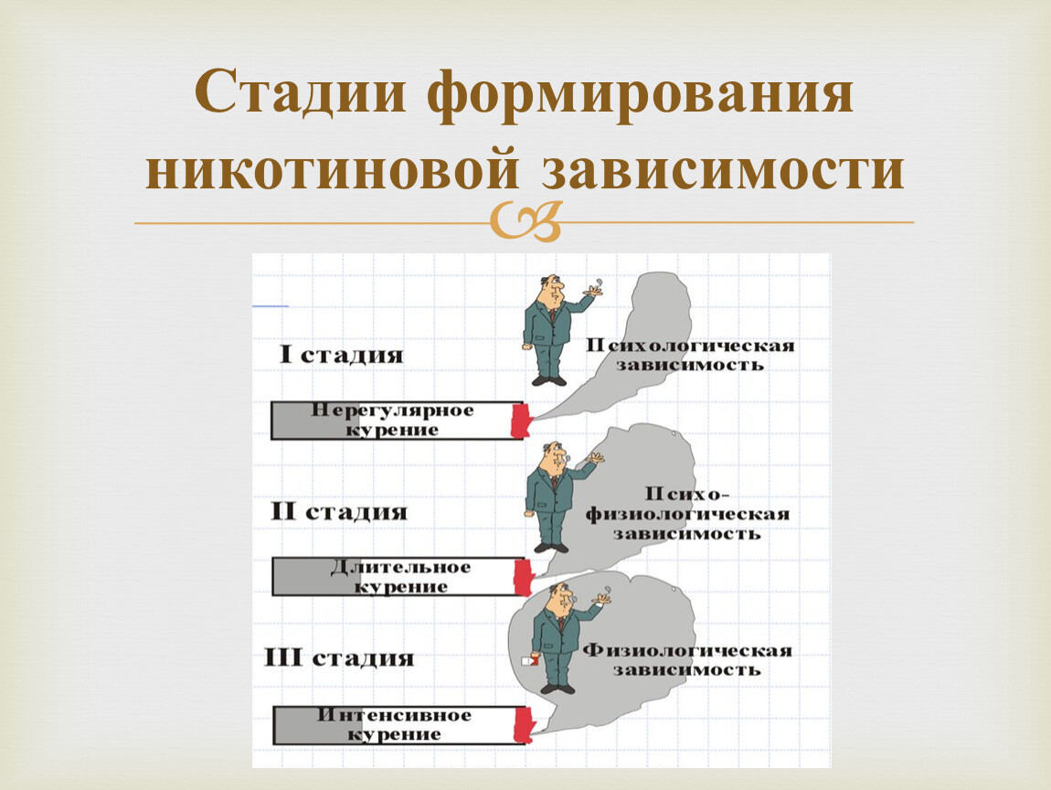 симптомы отмены – проявление физиологической стороны зависимости – раздражение, нервозность, сонливость, общее тягостное ощущение и желание закурить и т.п.;