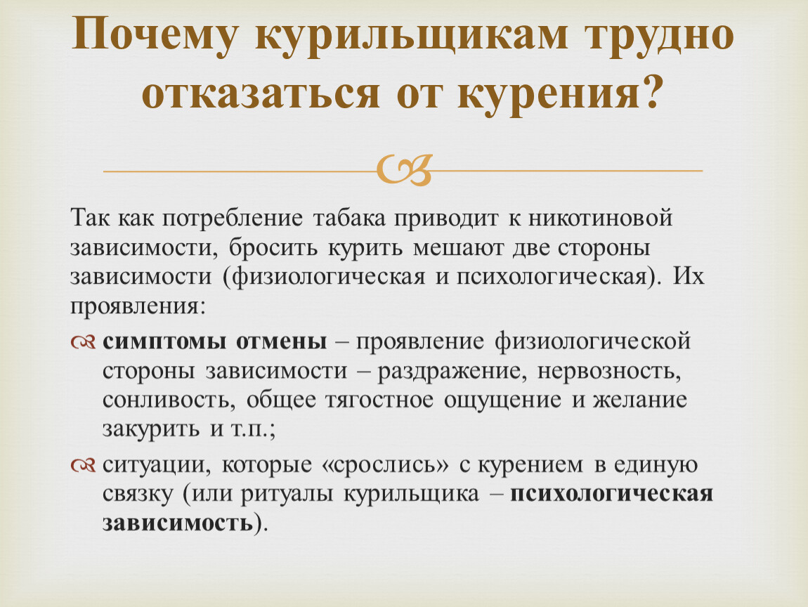 Так как потребление табака приводит к никотиновой зависимости, бросить курить мешают две стороны зависимости (физиологическая и психологическая). Их проявления: