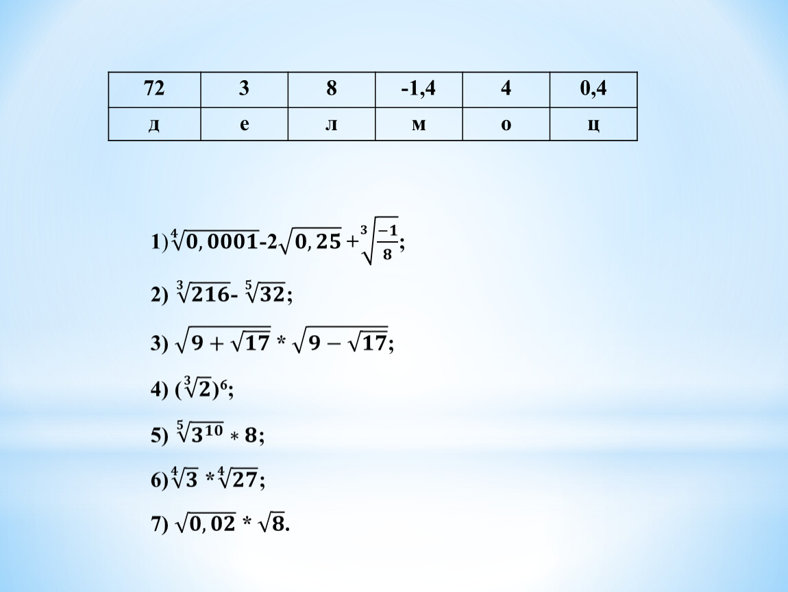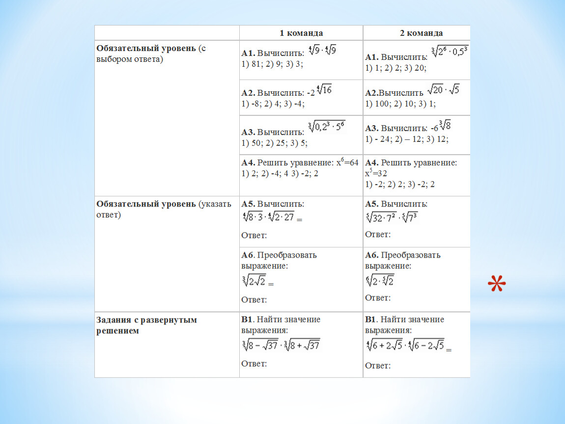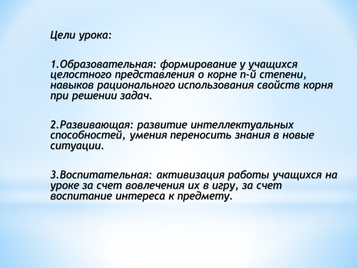 1.Образовательная: формирование у учащихся целостного представления о корне п-й степени, навыков рационального использования свойств корня при решении задач.