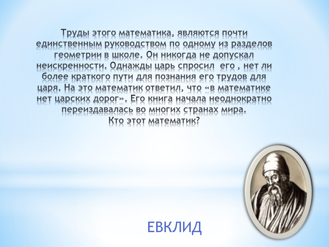 Труды этого математика, являются почти единственным руководством по одному из разделов геометрии в школе. Он никогда не допускал неискренности. Однажды царь спросил его , нет ли более краткого пути для познания его трудов для царя. На это математик ответил, что «в математике нет царских дорог». Его книга начала неоднократно переиздавалась во многих странах мира. Кто этот математик?