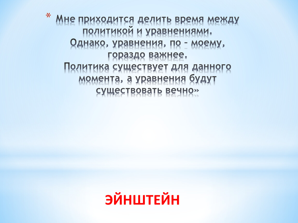 Мне приходится делить время между политикой и уравнениями.Однако, уравнения, по – моему, гораздо важнее.Политика существует для данного момента, а уравнения будут существовать вечно»