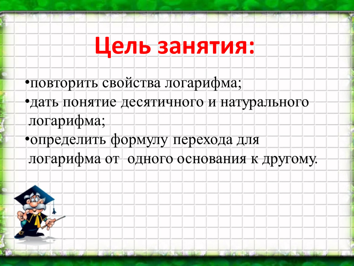 Пусть дан логарифм loga b. Тогда для любого числа c такого, что c > 0 и c ≠ 1, верно равенство: