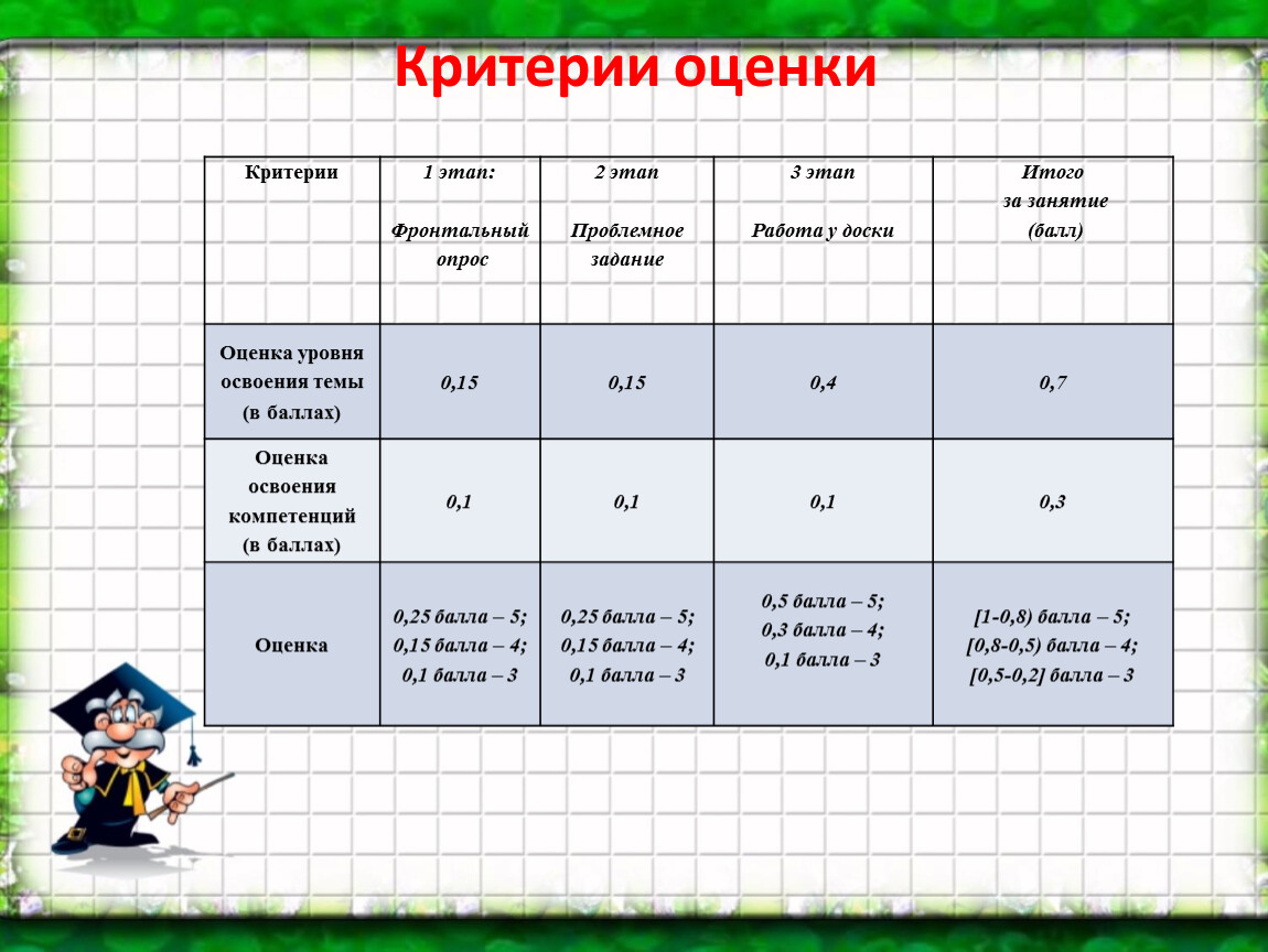 Оценка | 0,25 балла – 5; | 0,5 балла – 5; | [1-0,8) балла – 5; | |