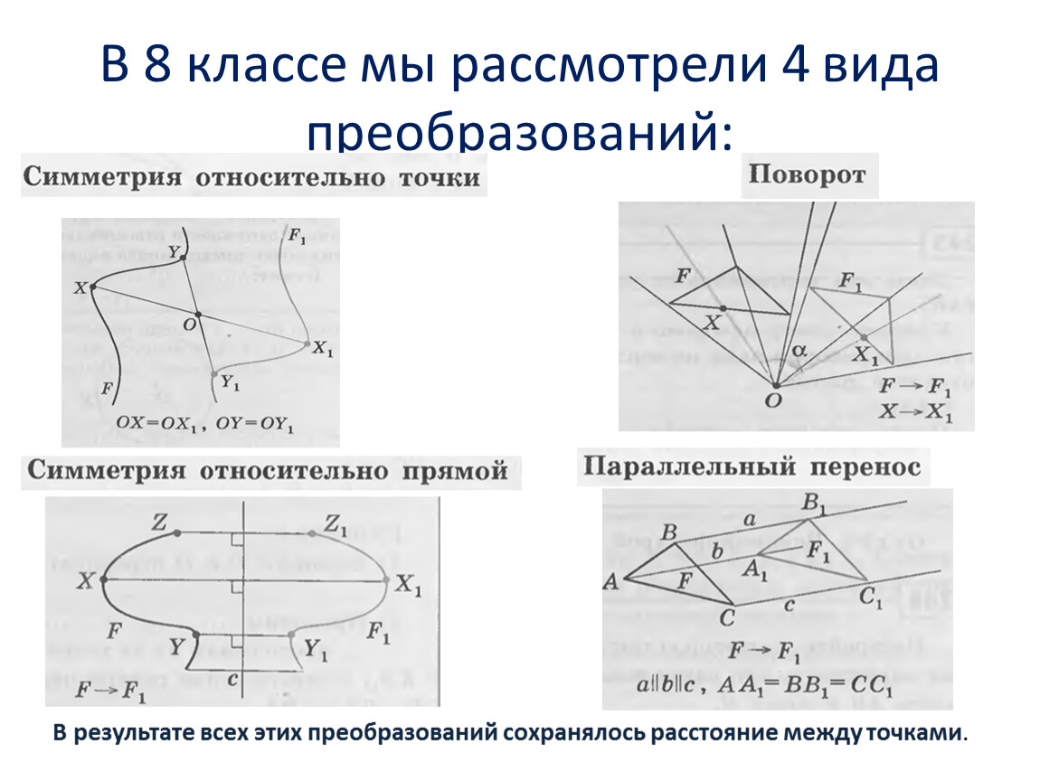 В 8 классе мы рассмотрели 4 вида преобразований: