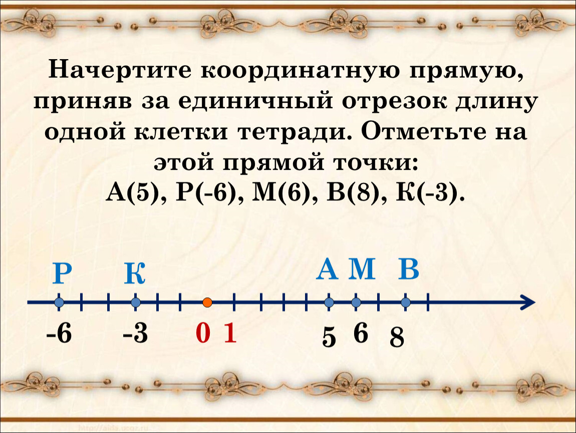 Начертите координатную прямую, приняв за единичный отрезок длину одной клетки тетради. Отметьте на этой прямой точки: