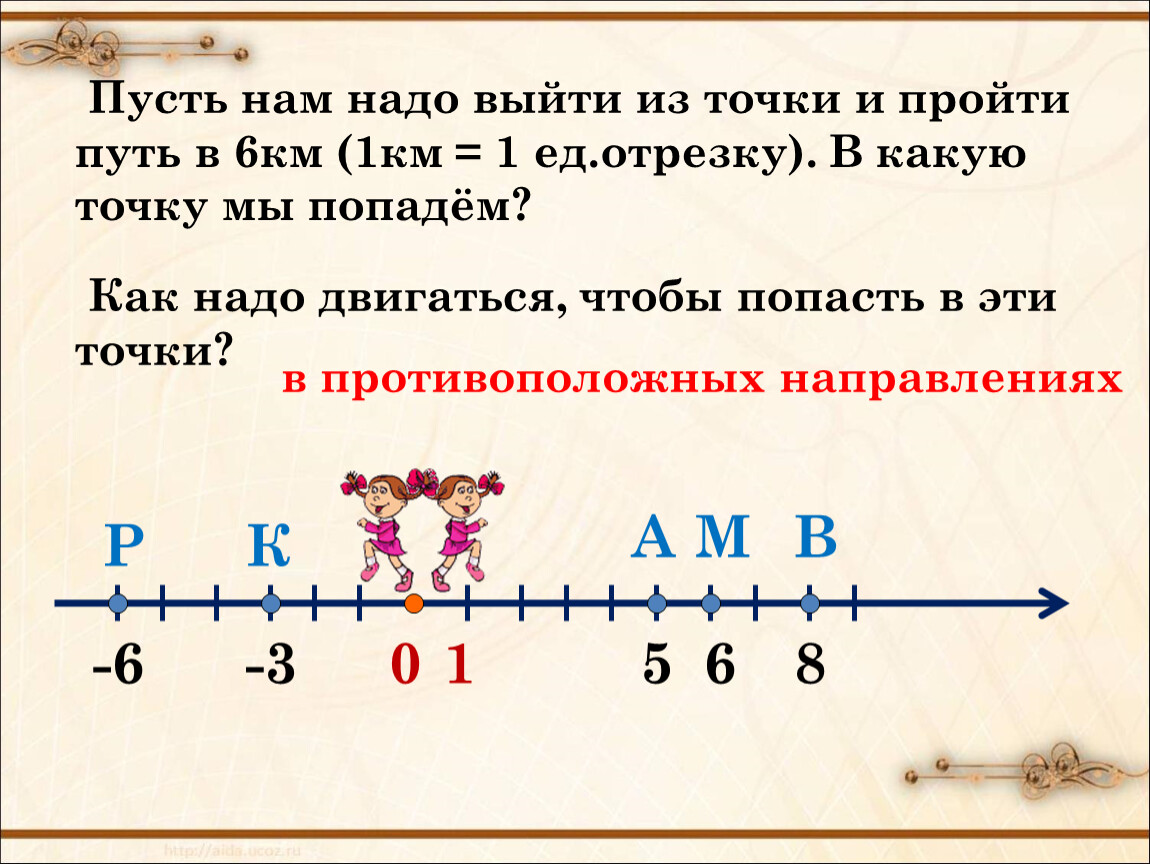 Пусть нам надо выйти из точки и пройти путь в 6км (1км = 1 ед.отрезку). В какую точку мы попадём?