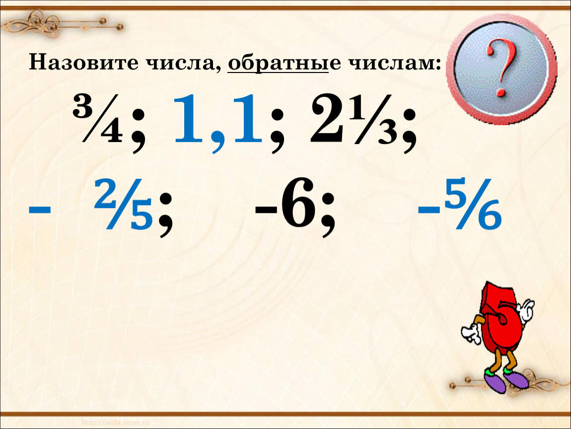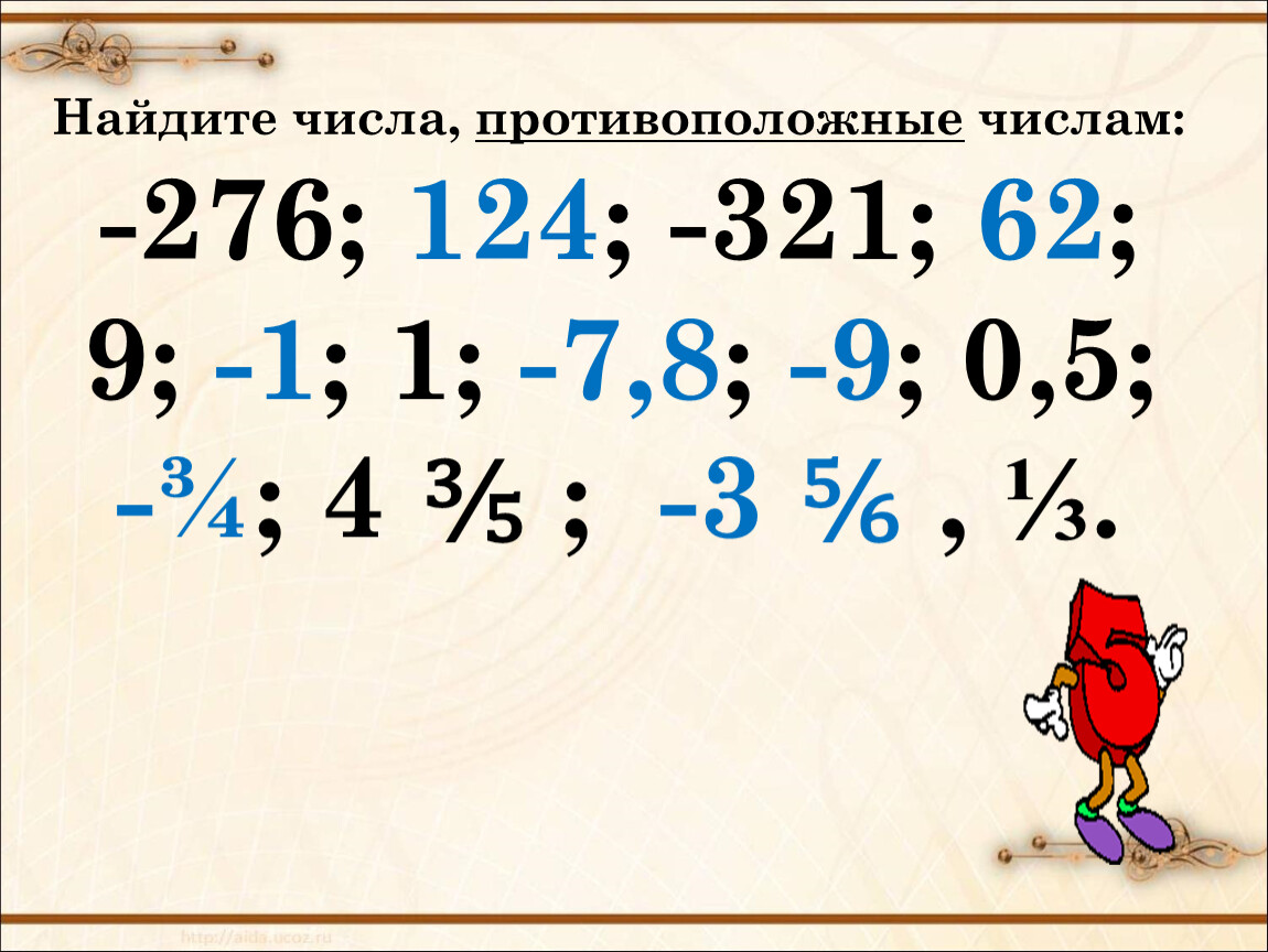 -276; 124; -321; 62; 9; -1; 1; -7,8; -9; 0,5; -¾; 4 ⅗ ; -3 ⅚ , ⅓.