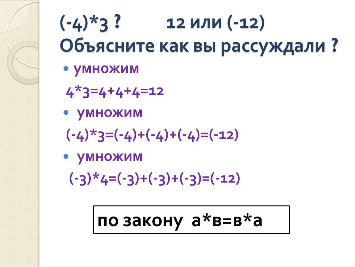 (-4)*3 ? 12 или (-12)Объясните как вы рассуждали ?