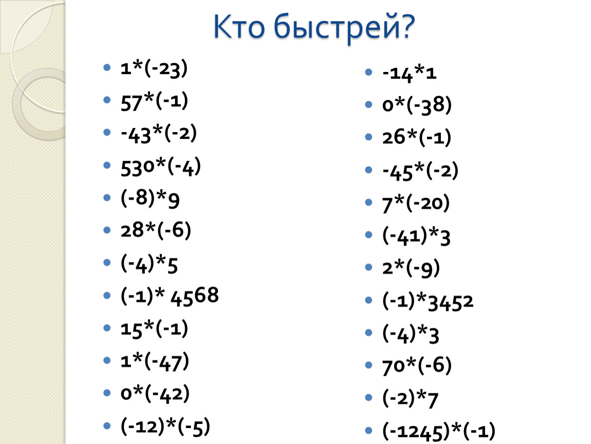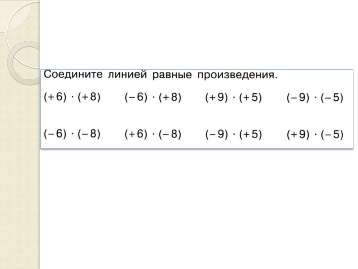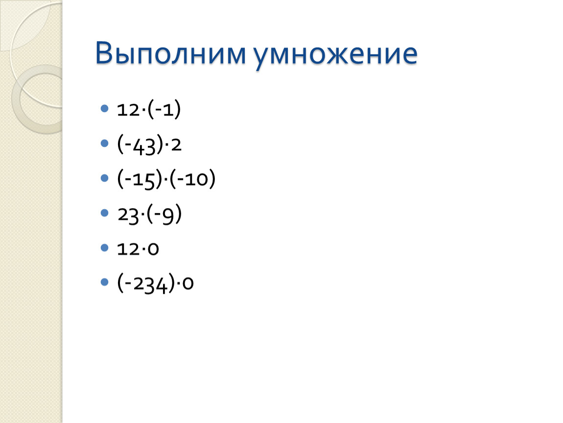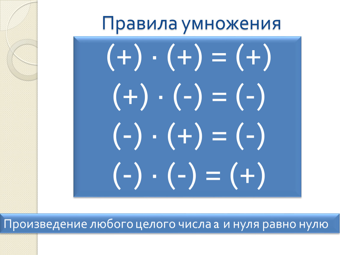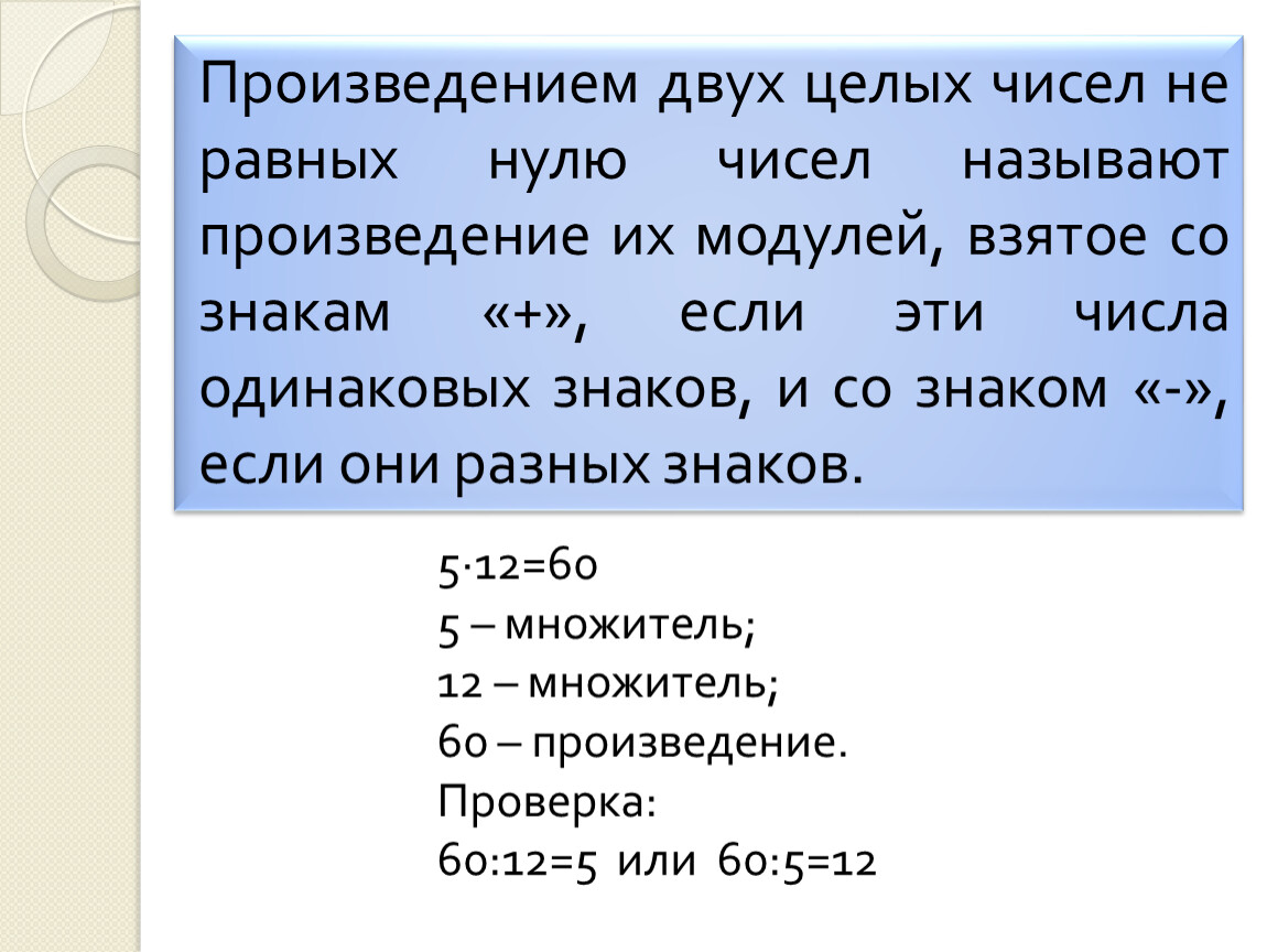 Произведением двух целых чисел не равных нулю чисел называют произведение их модулей, взятое со знакам «+», если эти числа одинаковых знаков, и со знаком «-», если они разных знаков.
