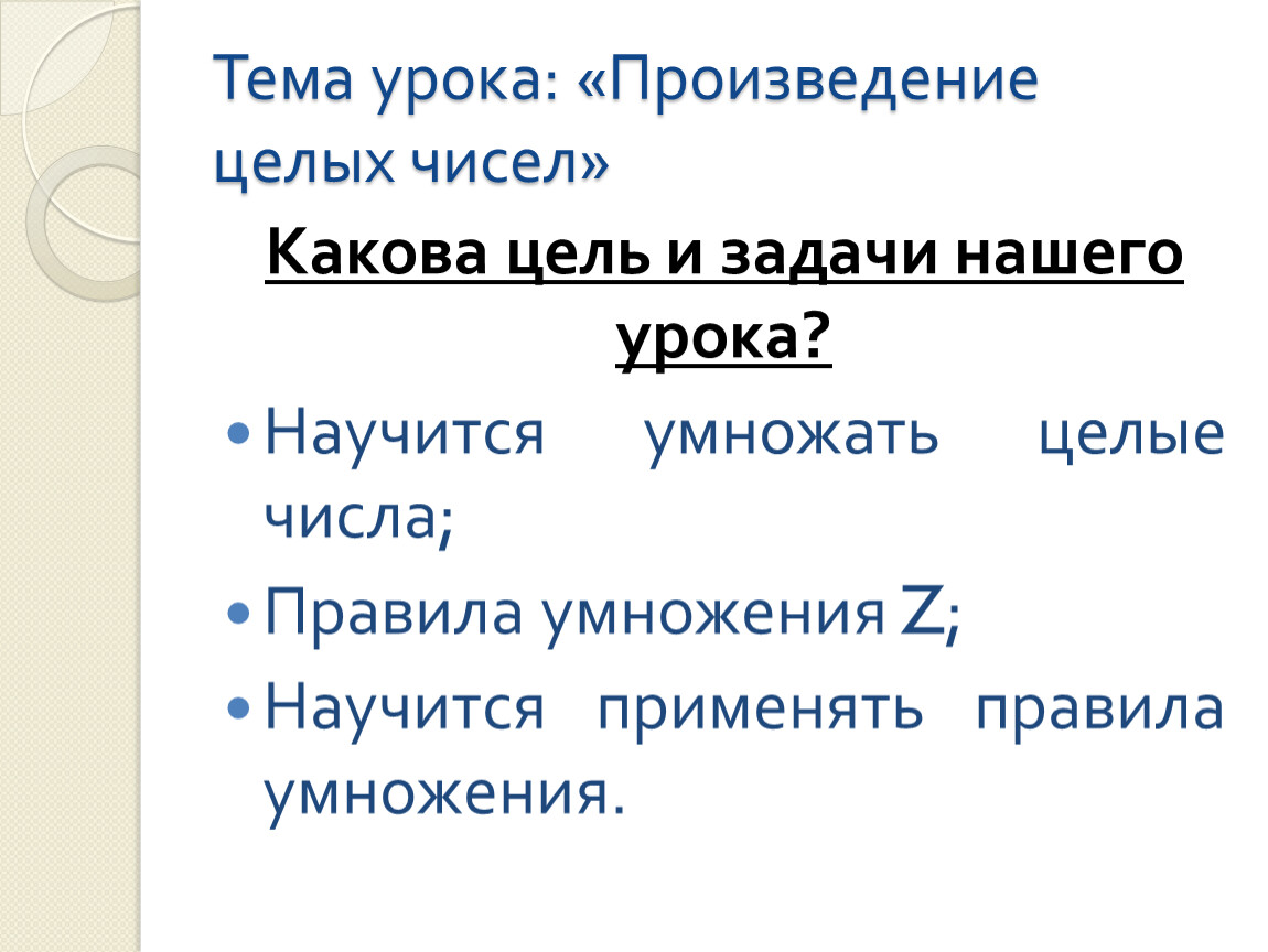 Тема урока: «Произведение целых чисел»