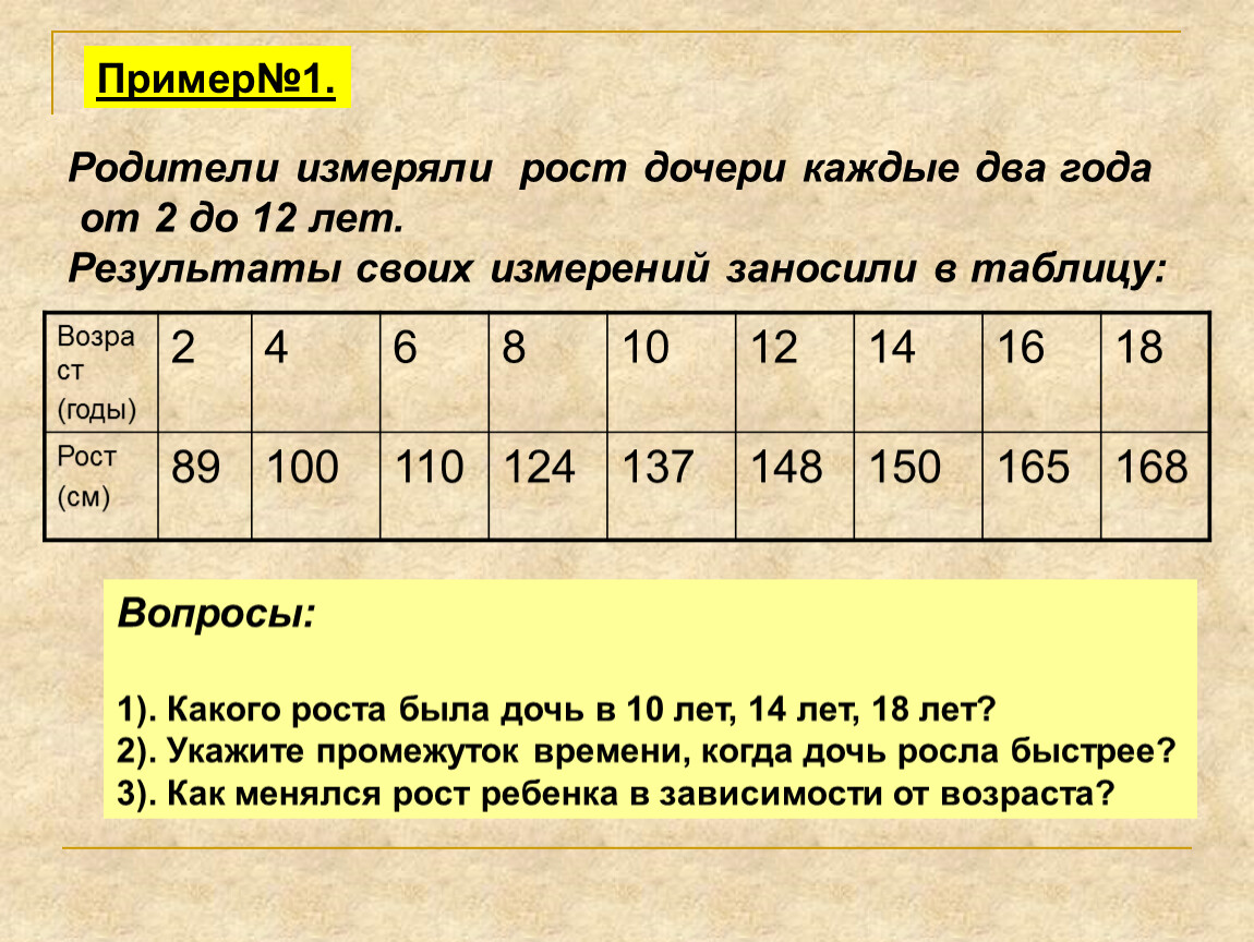 1). Какого роста была дочь в 10 лет, 14 лет, 18 лет?